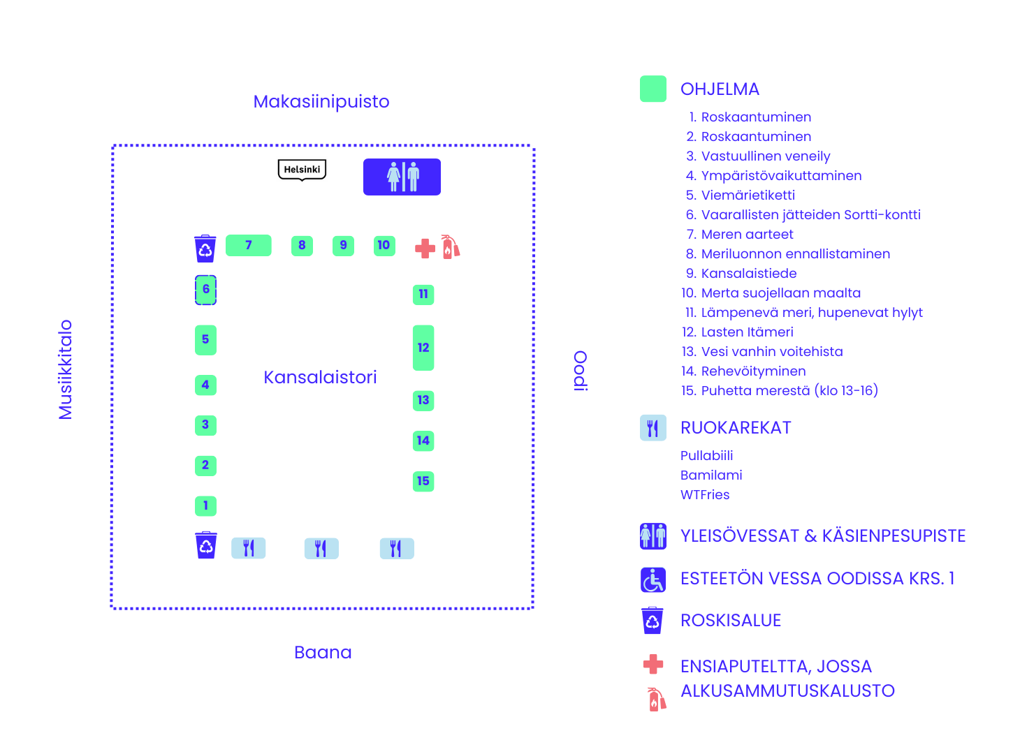 Kansalaistorilla on koko Itämerifestin ajan Sortti-kontti, jonne voit tuoda maksutta kodin vaarallisia jätteitä. Tarkemmat ohjeet vastaanotettavista jätteistä on luettavissa HSY:n vaarallisen jätteen verkkosivuilta. Paikalla on myös neuvontaa vaarallisten jätteiden lajittelusta.
