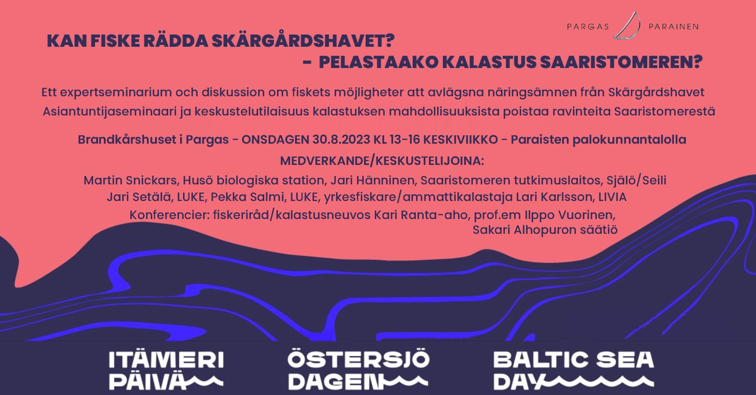 Saaristokaupunki Parainen taistelee rehevöityneen Saaristomeren pelastamiseksi, järjestämällä Itämeripäivän etkoina asiantuntijaseminaarin ja keskustelutilaisuuden, jossa tarkastellaan kalastuksen mahdollisuuksia ravinteiden vähentämiseksi Saaristomeressä. Seminaarin tavoitteena on tutkia kalastuksen potentiaalia meren tilaa parantavana toimenpiteenä sekä käsitellä kalatalouden tulevaisuuden tärkeitä kysymyksiä. Voidaanko alalle houkutella uusia ammattikalastajia, vai ovatko tulevaisuuden näkymät liian uhkaavia? Tule kuuntelemaan alan parhaita asiantuntijoita, jotka puhuvat Paraisten VPK-talolla keskiviikkona 30. elokuuta 2023 klo 13-16. Tapahtuma on Itämeripäivän etkot, eli päivä ennen itse Itämeripäivää. Tilaisuuden ohjelma julkaistaan myöhemmin.