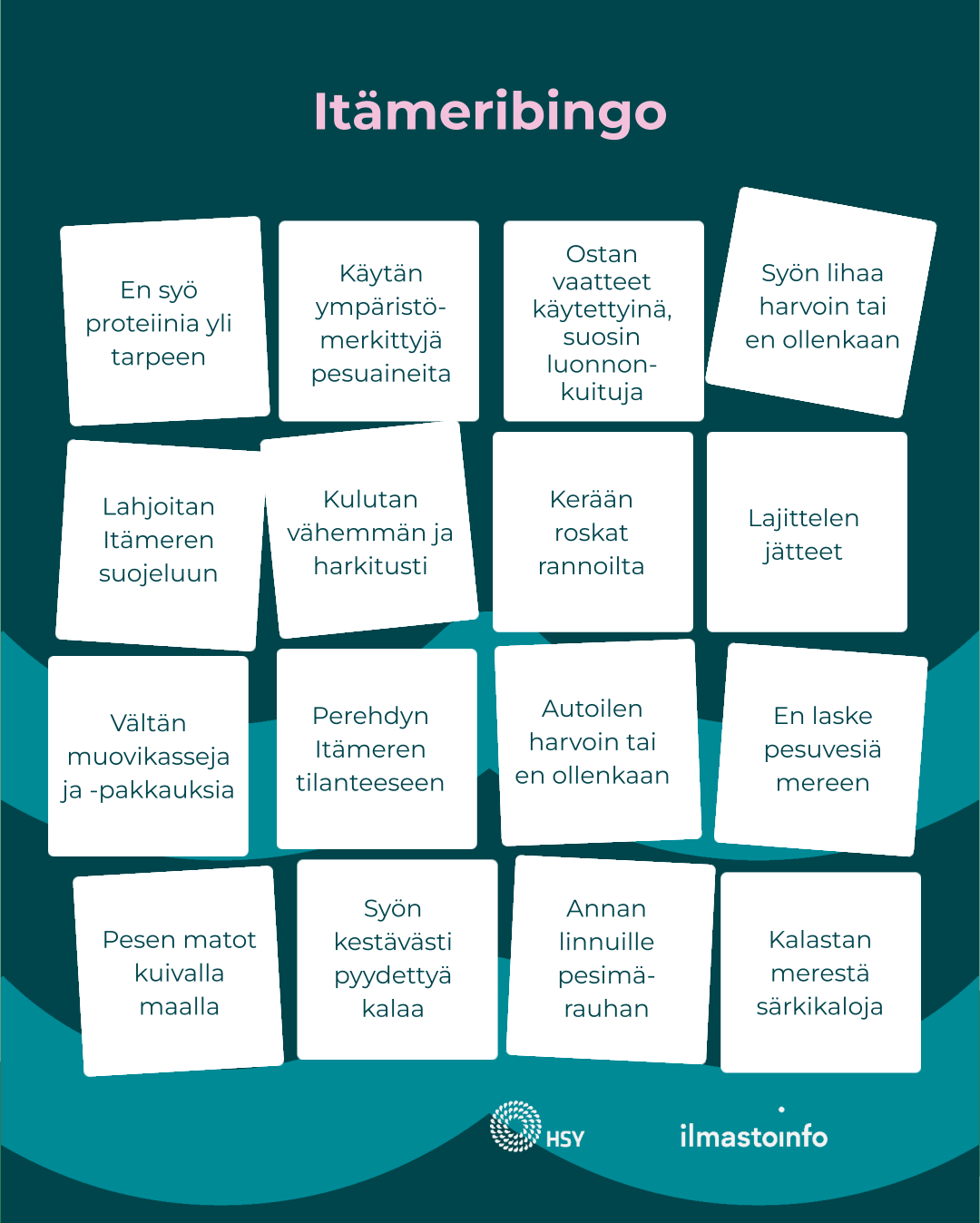 HSY:n Ilmastoinfo haastaa kaikki pelaamaan Itämeribingoa somessa. Itämeribingosta löytyy tärkeitä tekoja, joita voimme kaikki tehdä Itämeren hyväksi. Mitä tekoja sinä jo teet? Täytä bingolomake ja jaa se somekanavassasi. Samalla voit pohtia, mitä tekoja voisit vielä tehdä Itämeren hyväksi ja kannustaa tuttusikin mukaan.