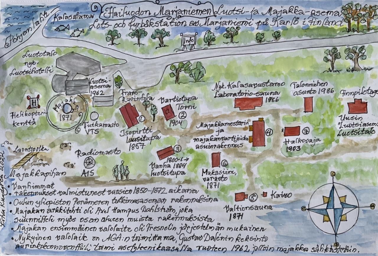 Tussipiirros ja vesiväreillä maalattu opaskartta Marjaniemen luotsi- ja majakka-aseman historiallisista rakennuksista. Tehty opetustarkoituksiin etenkin Hailuodon koululaisille ja muille majakalla vieraileville.