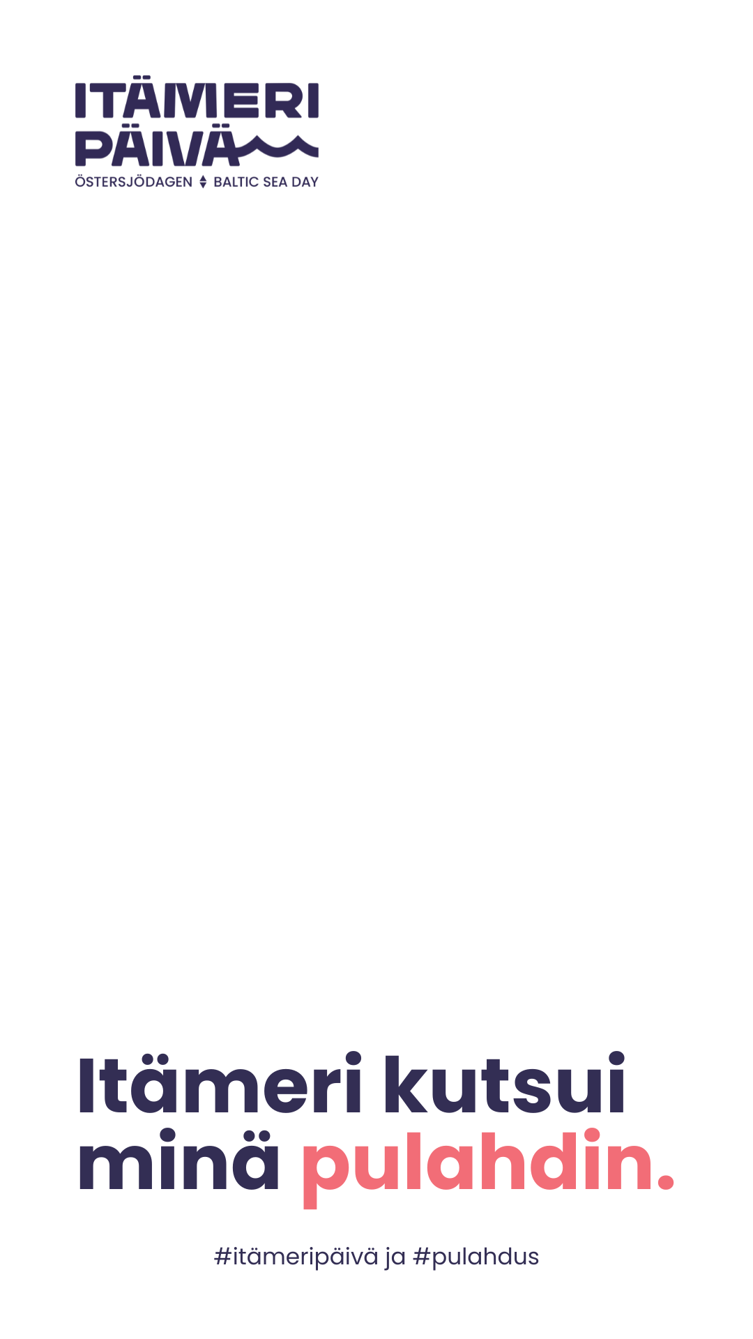 Jaa oma pulahduksesi someen muiden ihailtavaksi hashtageilla #itämeripäivä ja #pulahdus. Voit hyödyntää Instagram-storyssa Pulahdus-kuvakehystämme (PNG-kuva, johon saat lisättyä oman kuvasi). Lisää kehysvaihtoehtoja löydät materiaalipankista.